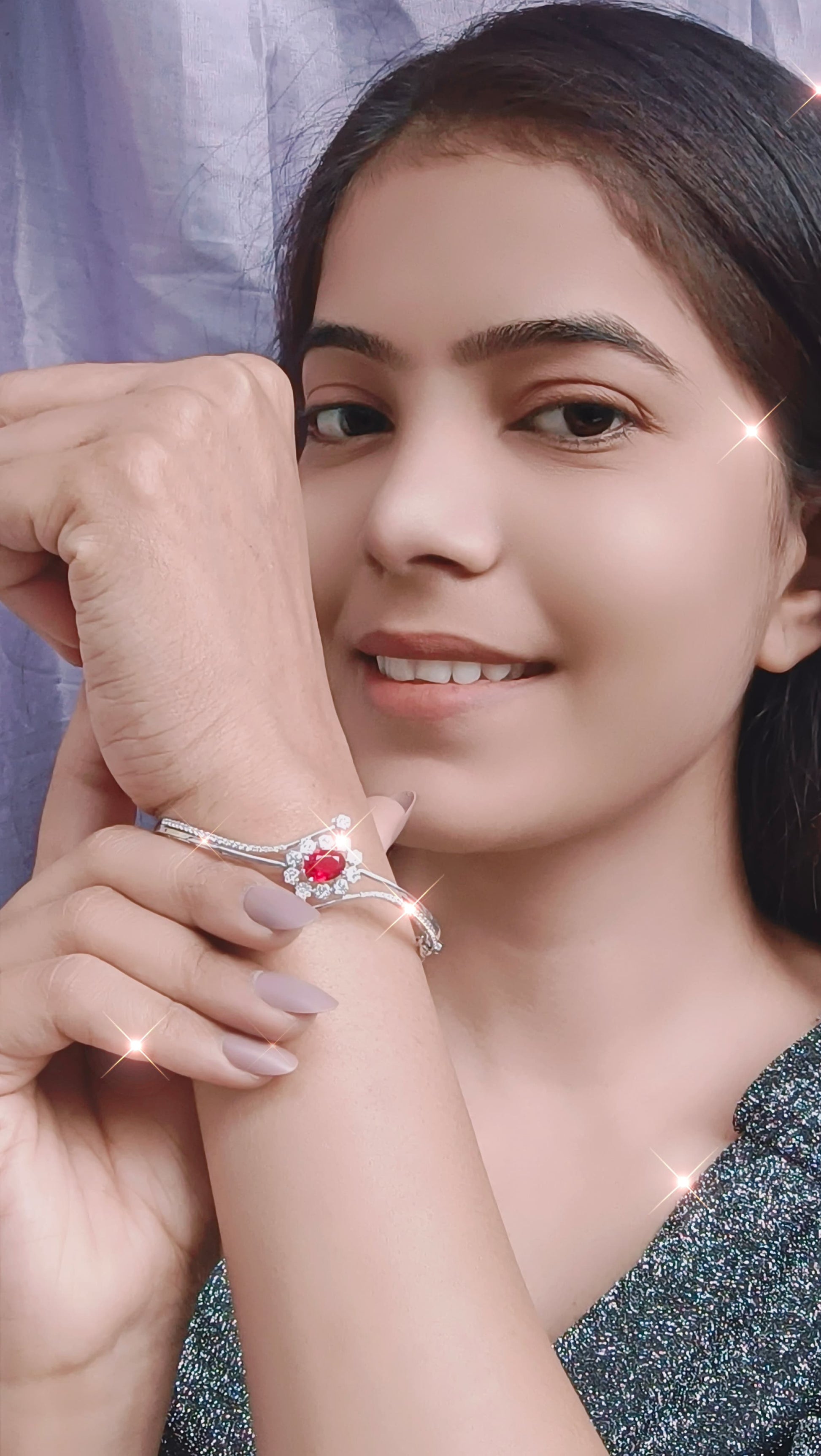 The Radiant Ruby Blossom Bracelet features a striking red gemstone encased in a floral halo of shimmering stones, exuding bold elegance and grace. Crafted in 925 Sterling Silver, this design symbolizes passion and beauty, making it an unforgettable addition to your jewelry collection.