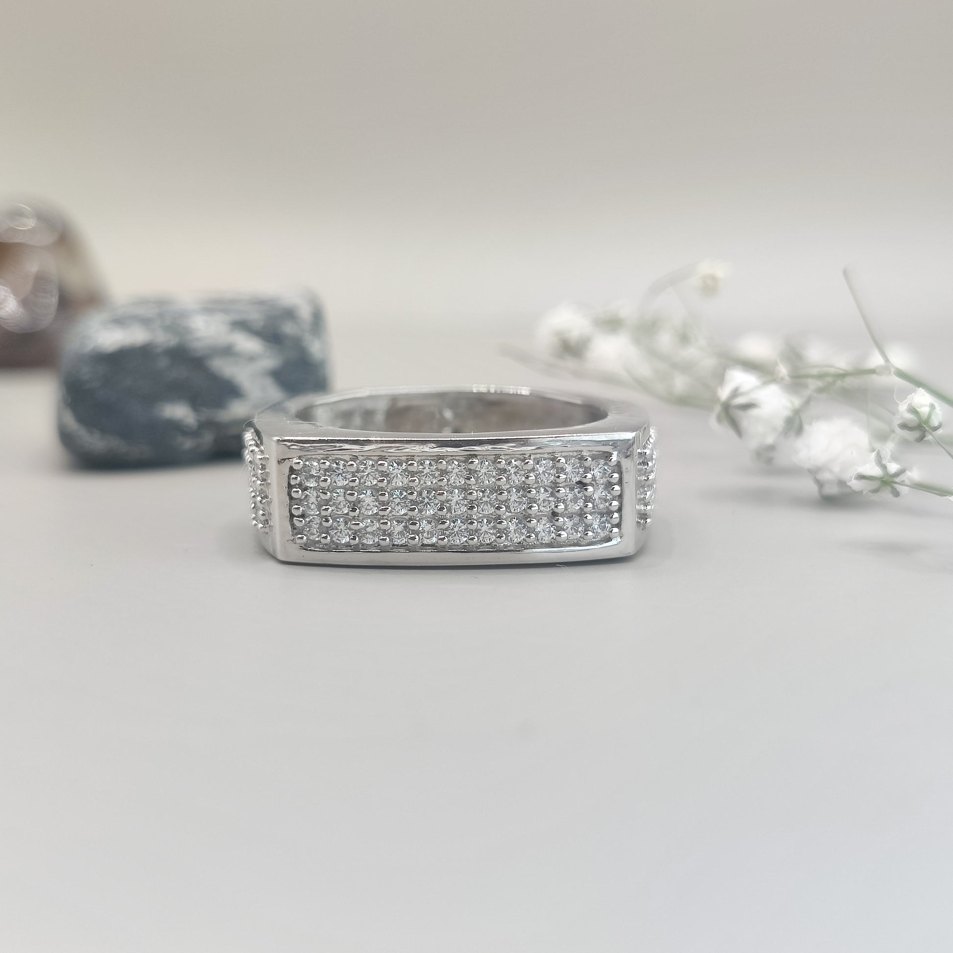 Add a touch of sophistication to your look with this Elegant Rectangular CZ Silver Ring for Men. Its sleek rectangular design is accented with shimmering CZ stones, creating a timeless accessory that enhances both casual and formal attire. A refined choice for the modern man who appreciates understated luxury.