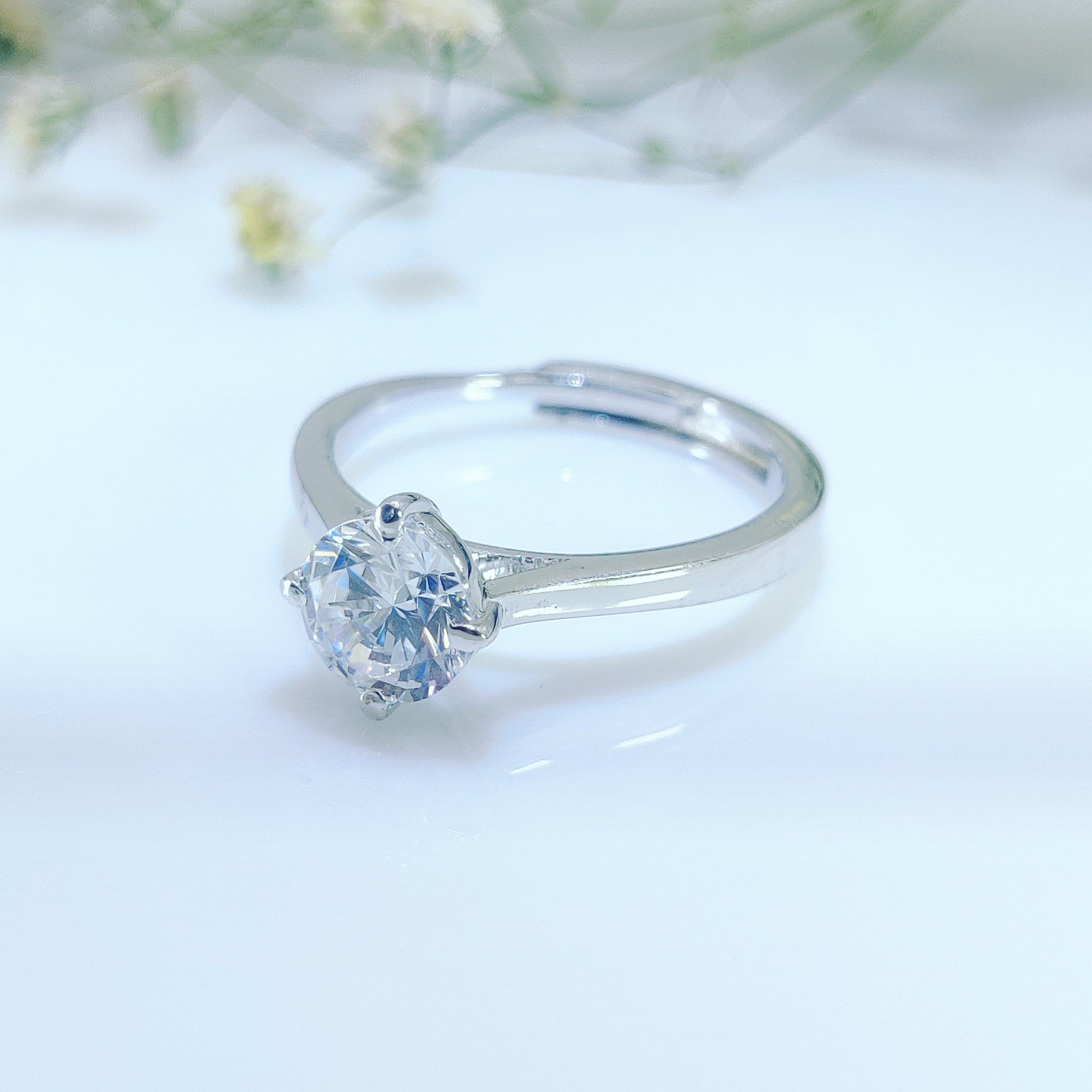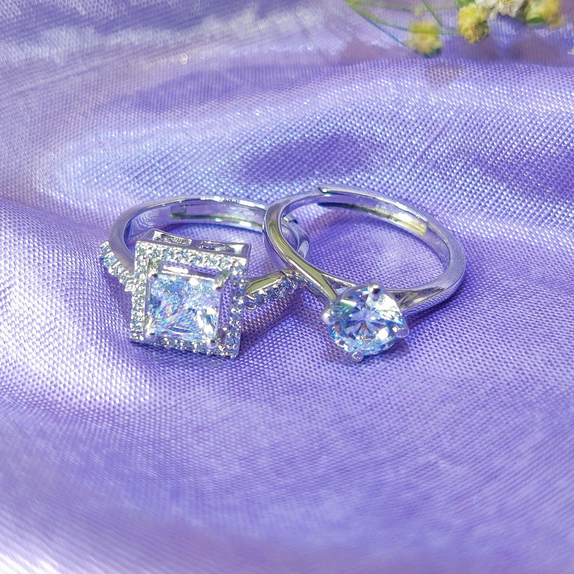 The Eternal Promise Couple Rings capture the essence of devotion. The men’s ring boasts a striking princess-cut solitaire framed by a dazzling halo, exuding strength and confidence. The women’s ring features a classic round-cut stone, symbolizing purity and everlasting affection.