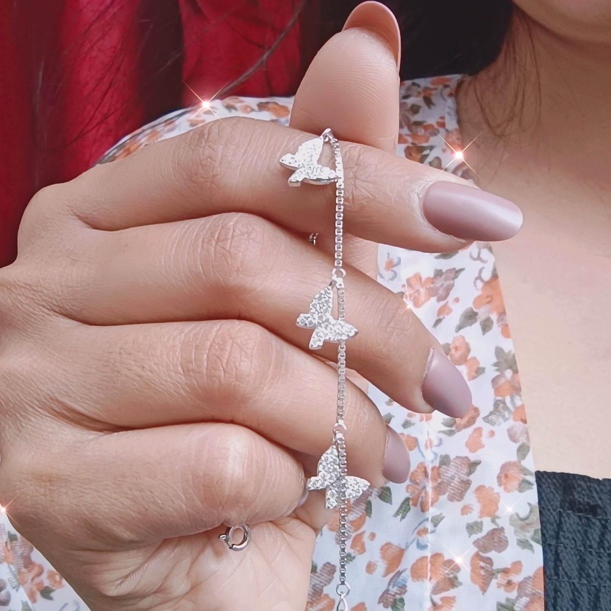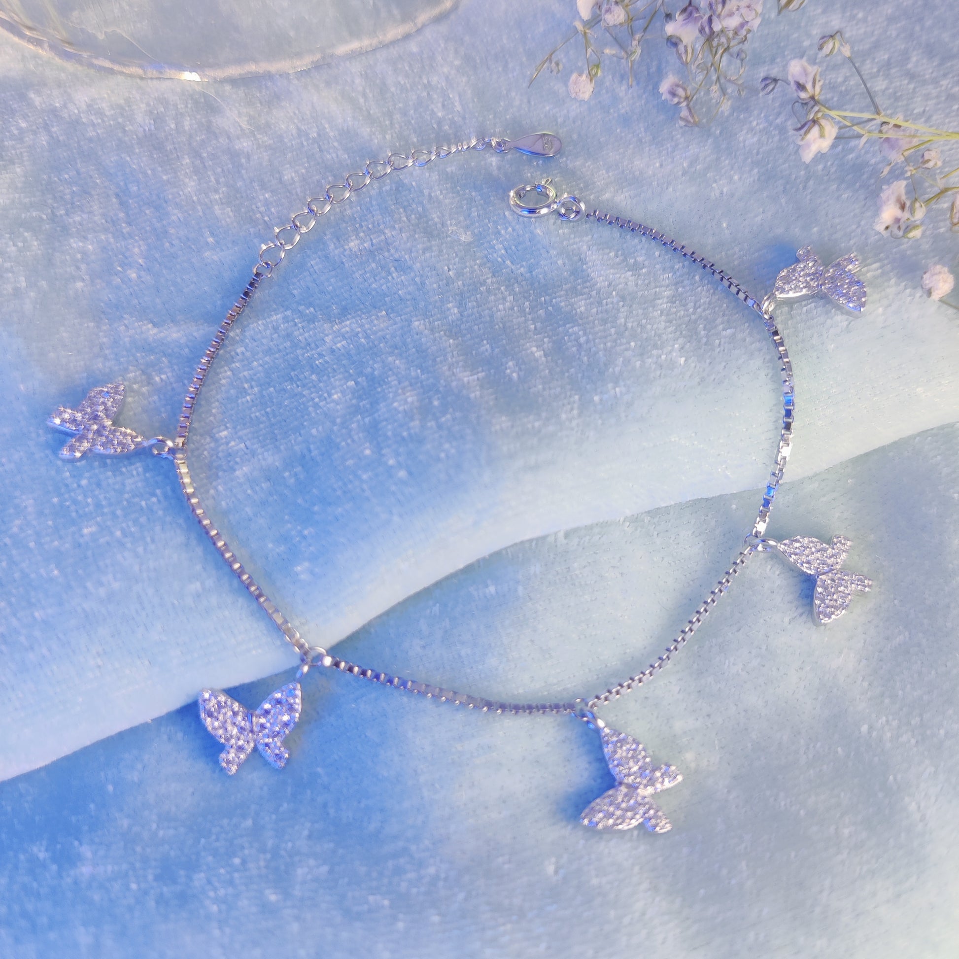 Let your inner softness fly. The Flutter Charm Butterfly Silver Bracelet captures the beauty of transformation with five delicate butterfly charms shimmering in every move. Whether you're dancing through your day or sharing a quiet moment, this bracelet speaks of lightness, freedom, and grace. A perfect match for your summer wardrobe or a gift that says "You're one of a kind."