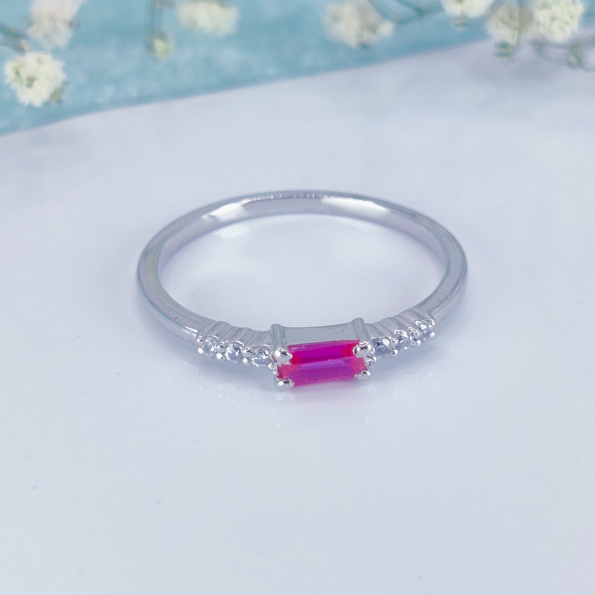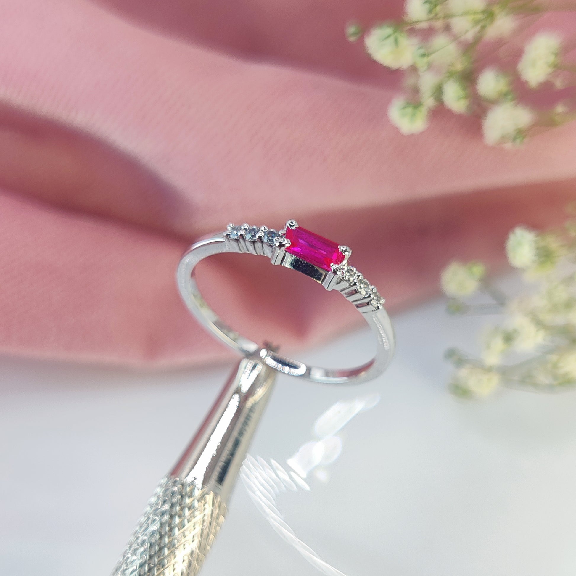 The Ruby Wink Ring may be minimal in form, but its presence is impossible to ignore. That sleek ruby baguette in the center? It's not just a gem—it’s a statement.