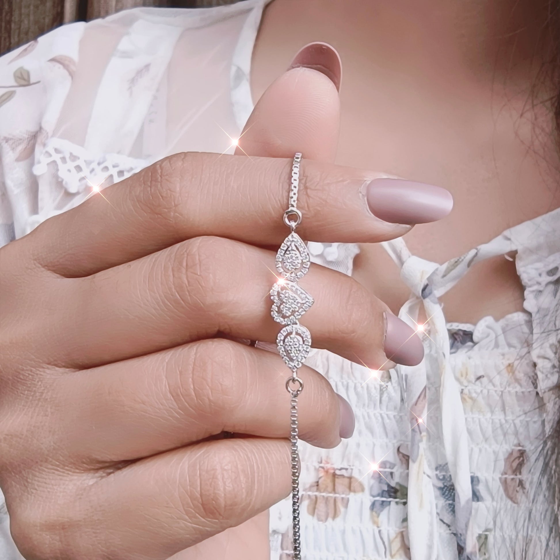 • Center Motif: Twin teardrop stones with a heart-shaped center