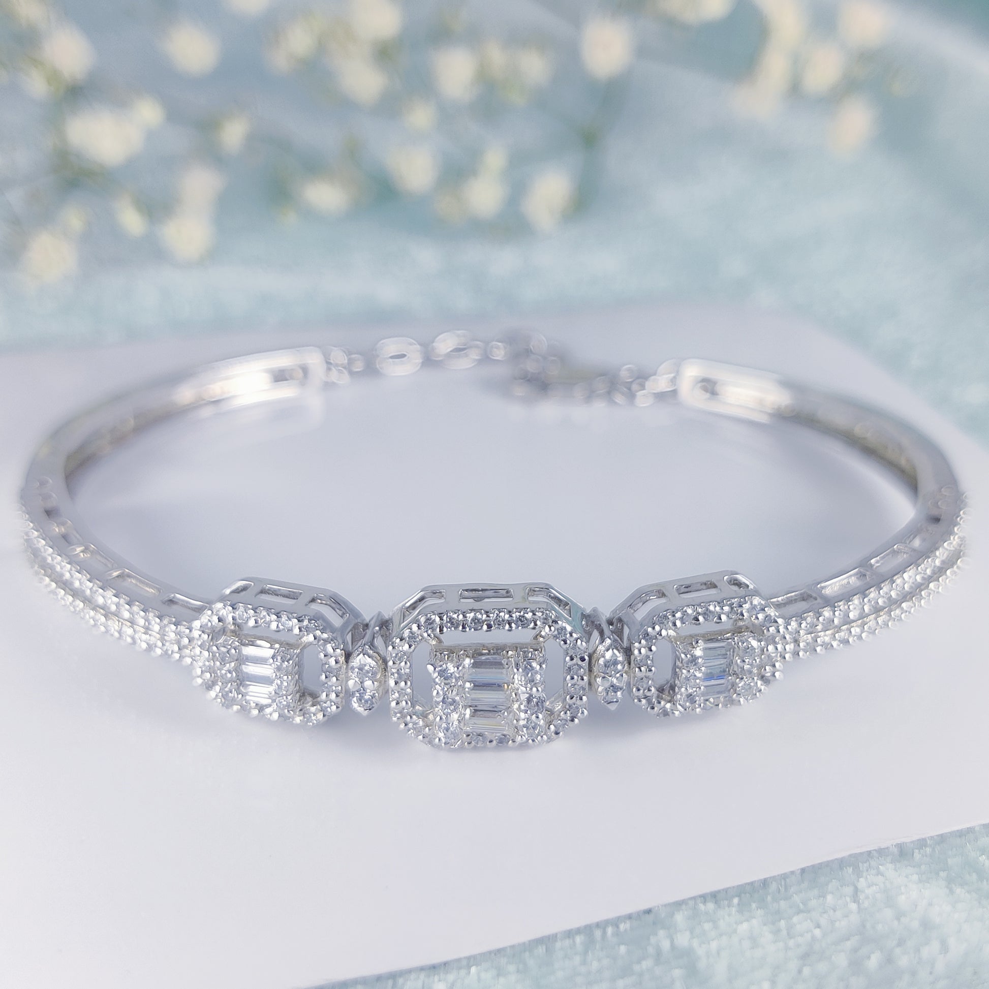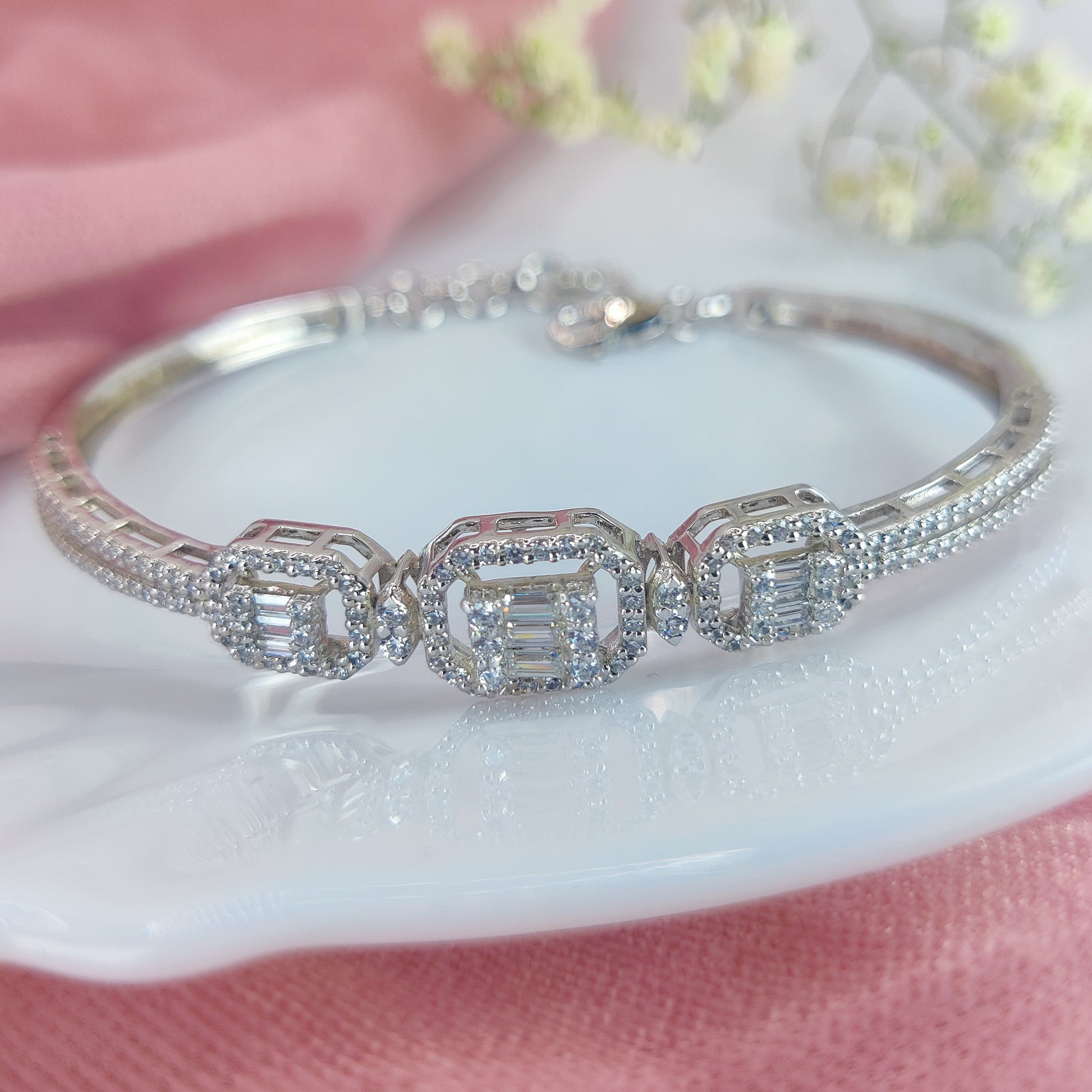 There's elegance in every era—and Timeless Grace Kada proves just that. With a trio of luxurious emerald-cut stone clusters, framed by a halo of dainty zircons, this bracelet feels like a classic heirloom with a modern soul. The dual-layered shimmer on each side adds a sculpted brilliance that flatters every wrist.