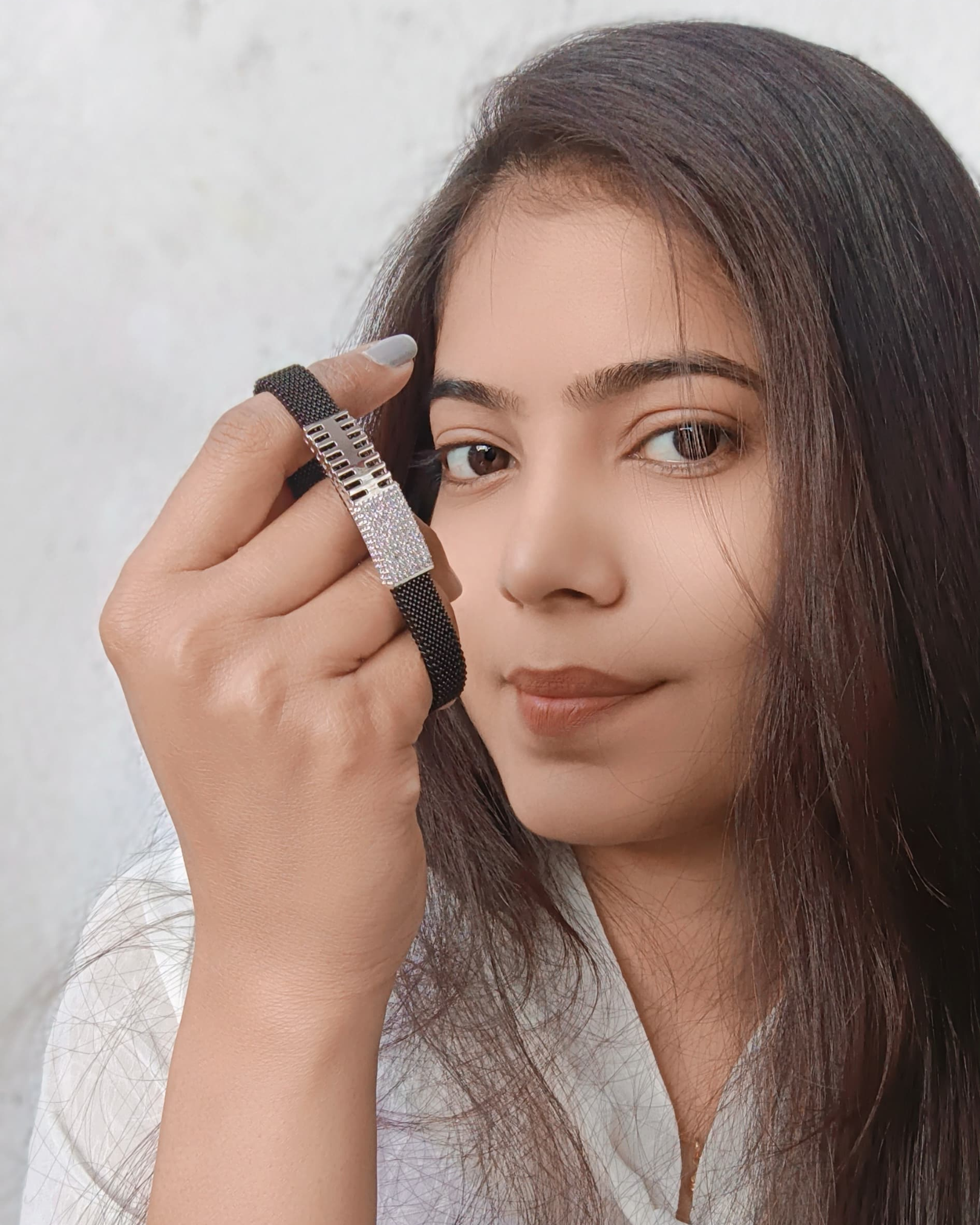 The Urban Crown Adjustable Bracelet is crafted for the woman who walks like a queen but slays like a boss. Featuring a bold rectangular studded panel paired with a sharp grille-cut design, this bracelet blends luxury and strength in every detail. Its sleek black mesh strap ensures a flawless fit for every wrist.